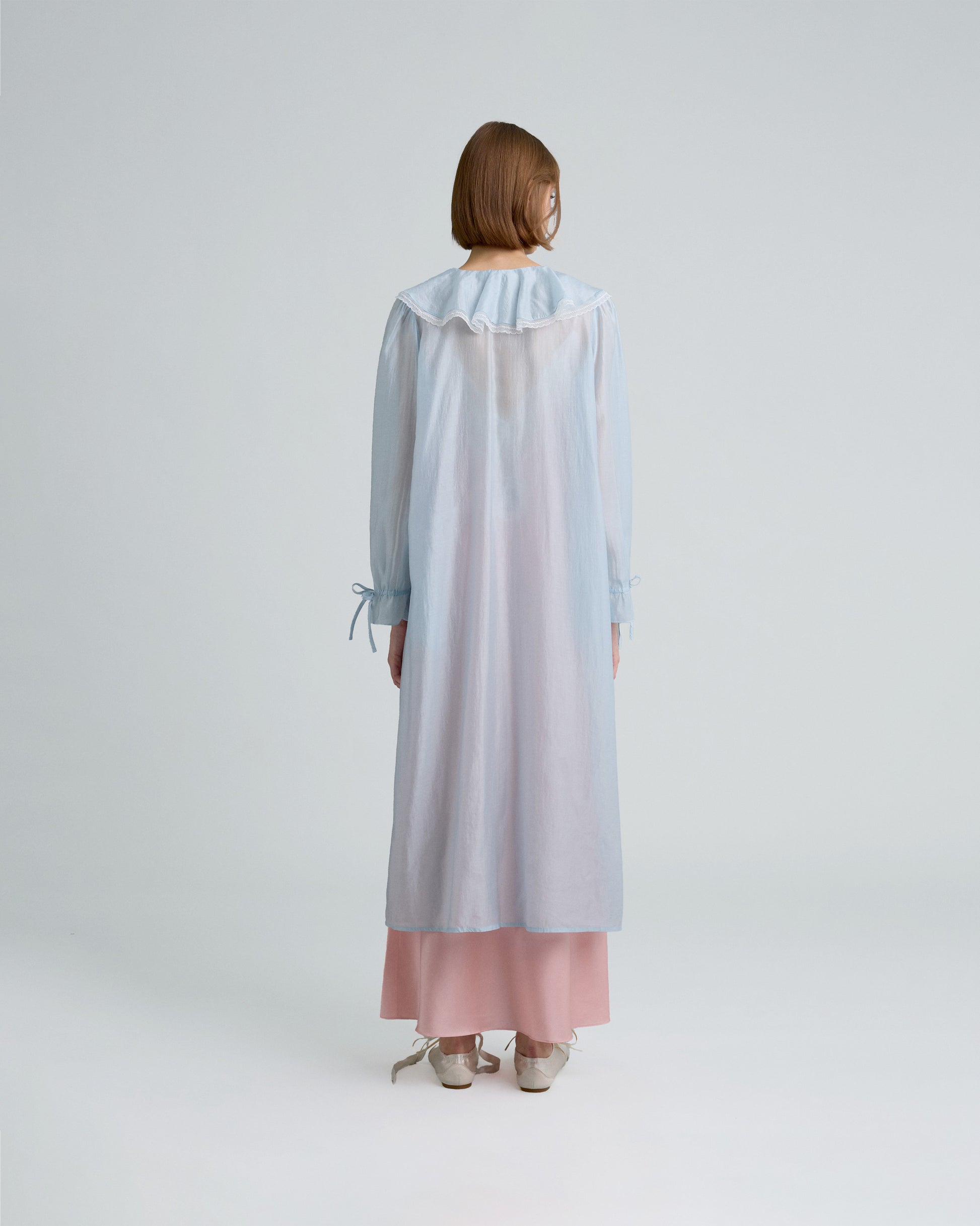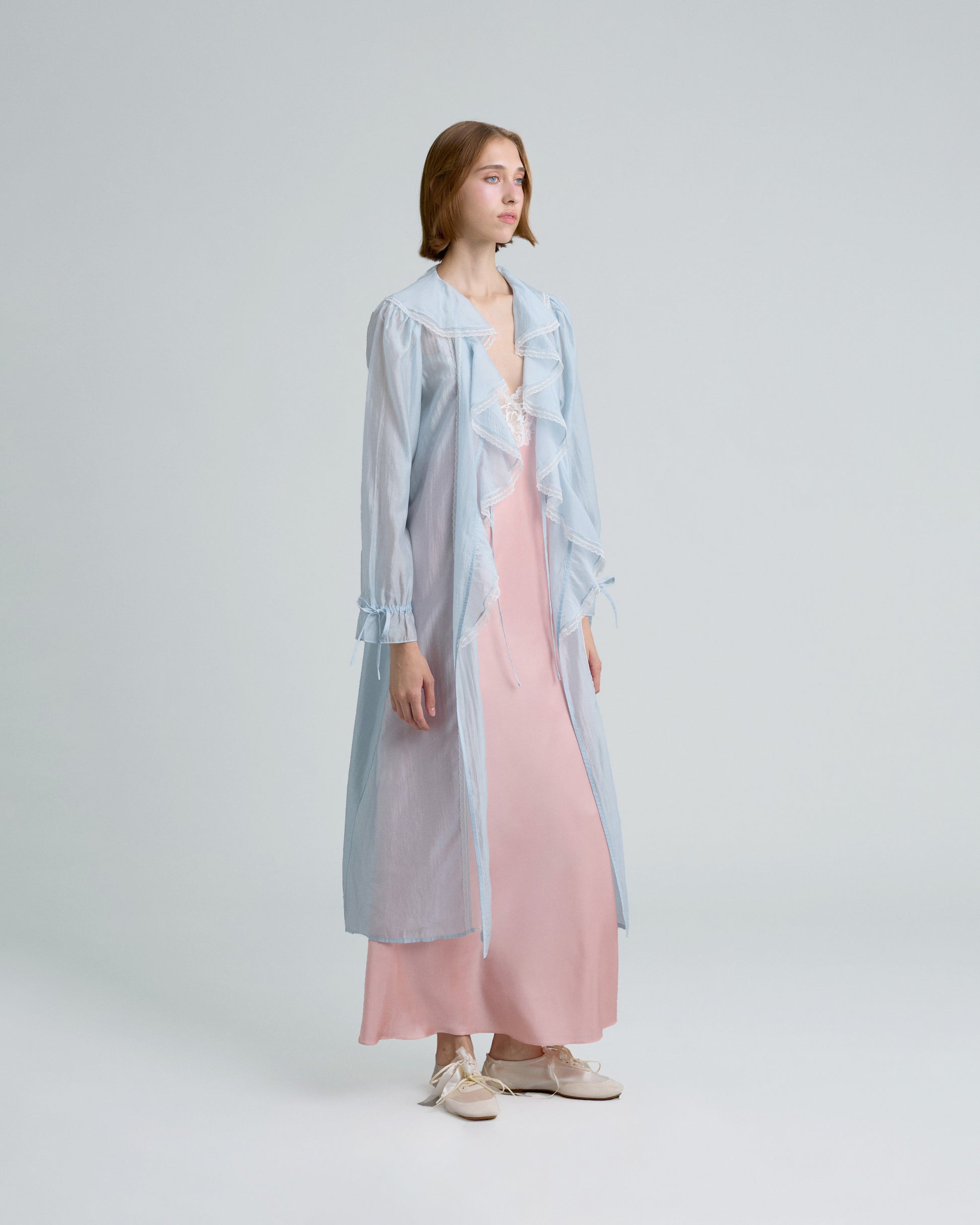 A lace-trimmed cardigan featuring a ruffled neckline and an adjustable waist tie.