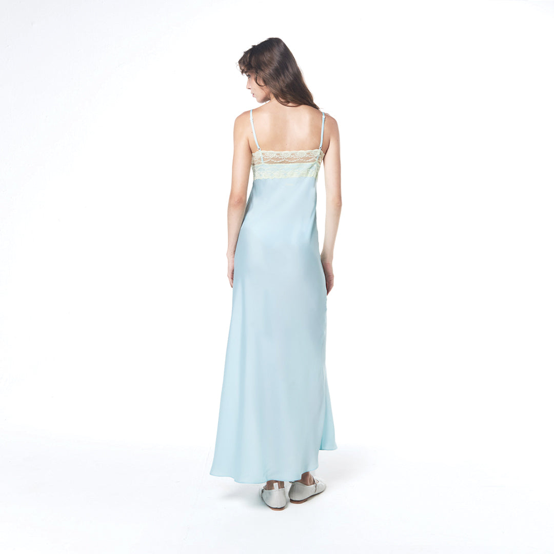 SATIN DRESS WITH LACE DECORATION AND ADJUSTABLE STRAPS.