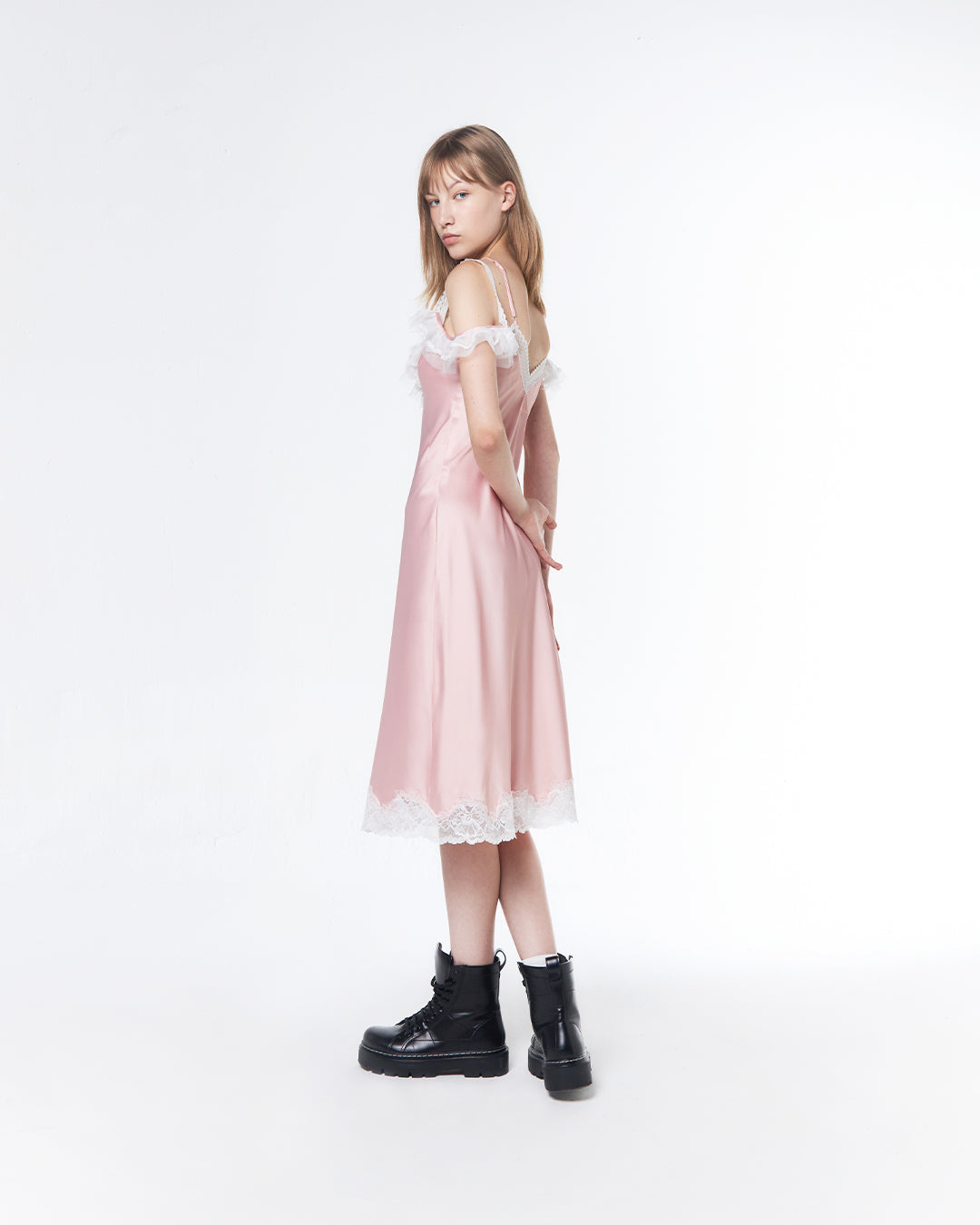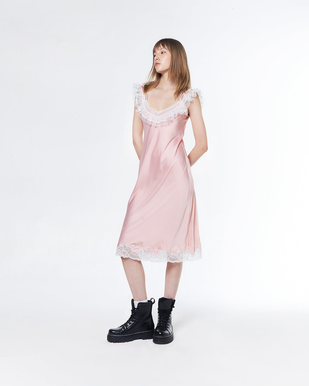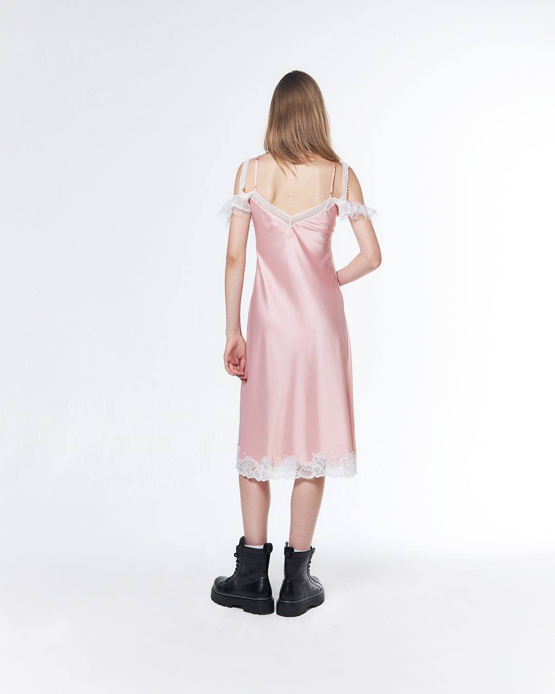 SATIN DRESS WITH LACE DECORATION AND ADJUSTABLE STRAPS.