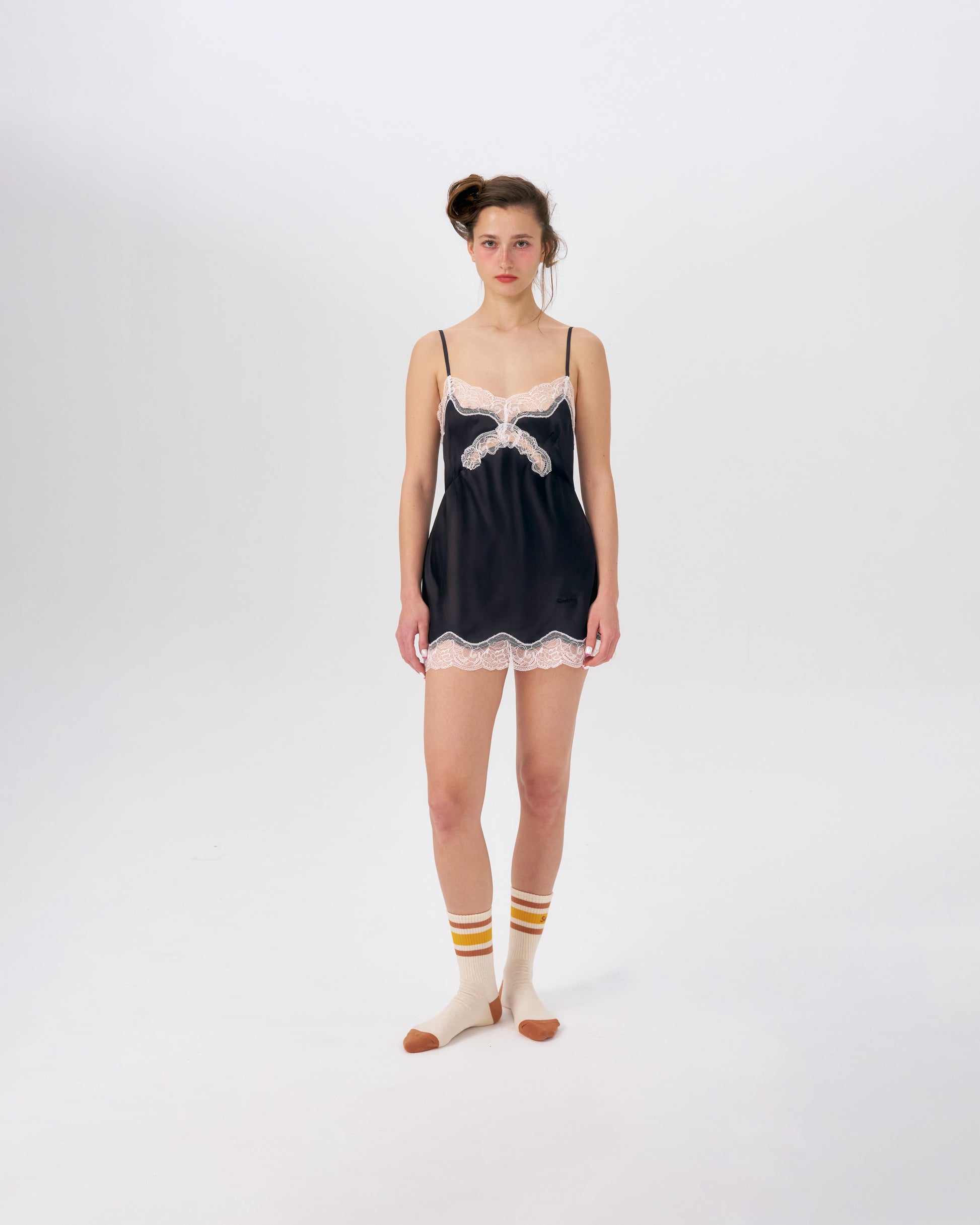 SATIN MINI DRESS WITH LACE DECORATION AND ADJUSTABLE STRAPS.